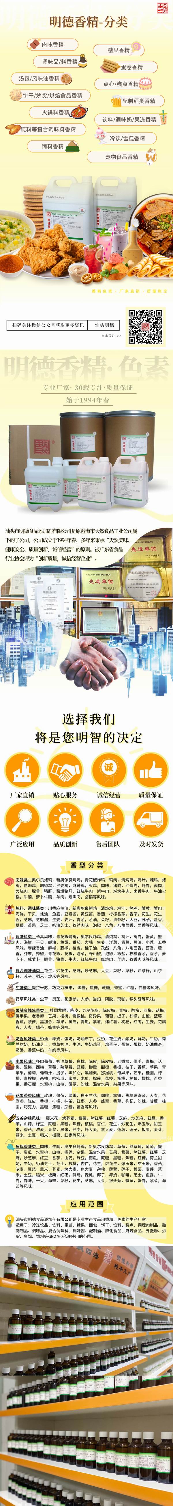 適用范圍:適用于固體/液體飲料、雪糕、冰棒、奶制品、糕點(diǎn)、果醬、夾心餅干、小食品及烘焙食品等GB2760允許添加食品用香精的食品。