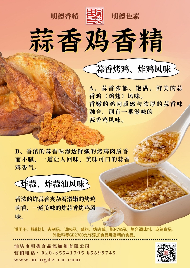 明德蒜香風味系列香精 多級蒜香 覆蓋多場景汕頭市明德食品添加劑有限公司推出的蒜香風味系列香精,覆蓋水溶性、油溶性與粉末等多種形態(tài),既能呈現(xiàn)新鮮大蒜、炸蒜、熟蒜油等不同調性,又兼顧耐溫與留香表現(xiàn),適用于醬料、肉制品、調味品、休閑零食及復合調味等B端應用。以下為本系列核心單品與香氣描述